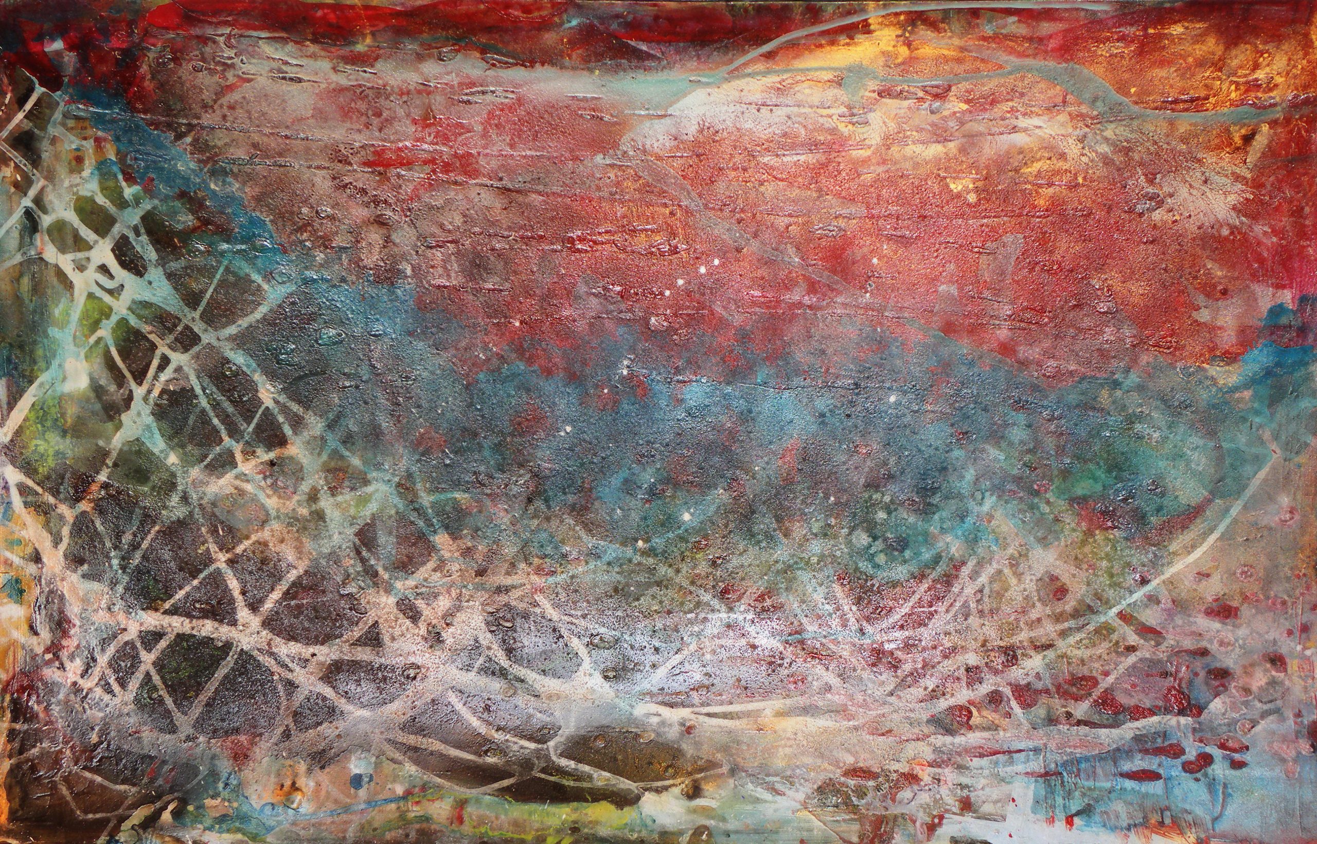 La sintesi perfetta di questo viaggio sinaptico tra il micro ed il macro, tra lo spirito e la materia è rappresentato dal capolavoro intitolato Geoembrione (2011), anche questo realizzato a tecnica mista su polistirene. Un semplice corpuscolo sub-atomico viene isolato pittoricamente in una provetta espressiva, ma sondandolo con lo sguardo possiamo verificarne la potenza evocativa sino a comprenderne l’unicità compositiva. All’interno dell’agglomerato cromatico possiamo distinguere pianeti, stelle, galassie strutturate in formazioni materiche quasi indistinte dall’uniformità denotativa. Il mondo, l’universo intero e la vastità di cui facciamo parte vengono così racchiusi in un micro – organismo. Il miracolo della forma, della mente e delle cose esistenti convertono la materia in spirito.