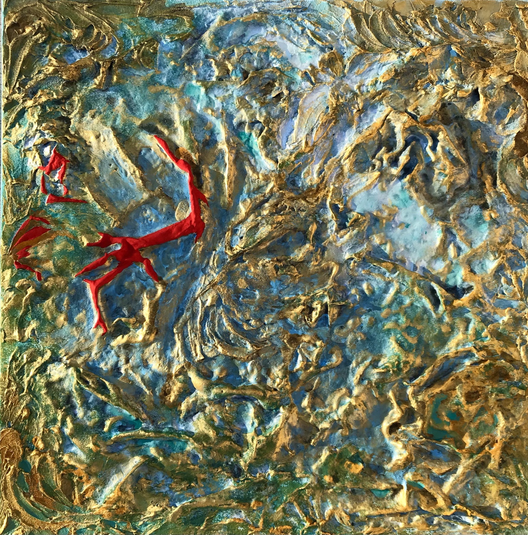 Le nervature materiche sono distribuite in maniera concentrica rispetto al centro del quadro, come a voler racchiudere e quindi opprimere l’anima che tenta di fuggire. Il celeste è il colore simbolo dell’infinito, ma chiaro e debole, quindi incapace di sfuggire all’oppressione.